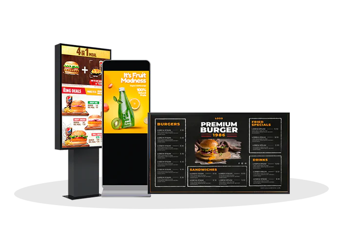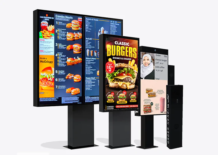 اكتشف إمكانيات الطلب التي لا حصر لها من خلال القائمة الرقمية الخارجية الأحادية والمزدوجة. تعرض شاشات العرض عالية الدقة هذه قائمة الطعام الخاصة بك في مطاعم الوجبات السريعة أو المقاهي الخاصة بك ويتم إدارتها من خلال نظام إدارة المحتوى الرقمي اللامتناهي لدينا وهي تتميز بالمتانة والكفاءة، وتوفر تحديثات سلسة ومرئيات مبهرة، مما يعزز تجربة العملاء ويعزز المبيعات